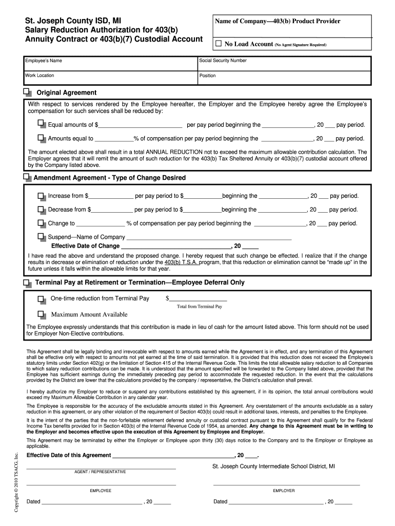 St. Joseph County ISD, MI Salary Reduction Authorization for 403(b) Annuity Contract or 403(b)(7) Custodial Account Name of Company403(b) Product Provider No Load Account (No Agent Signature Required)