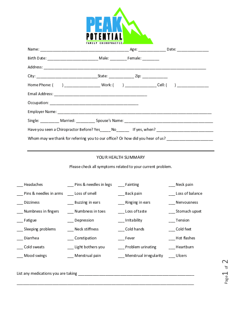 Name: Age: Date: Birth Date: Male: Female: Address: City: State: Zip: Home Phone: () Work: () Cell: () Email Address: Occupation: Employer Name: Single: Married: Spouses Name: Have you seen a Chiropractor
