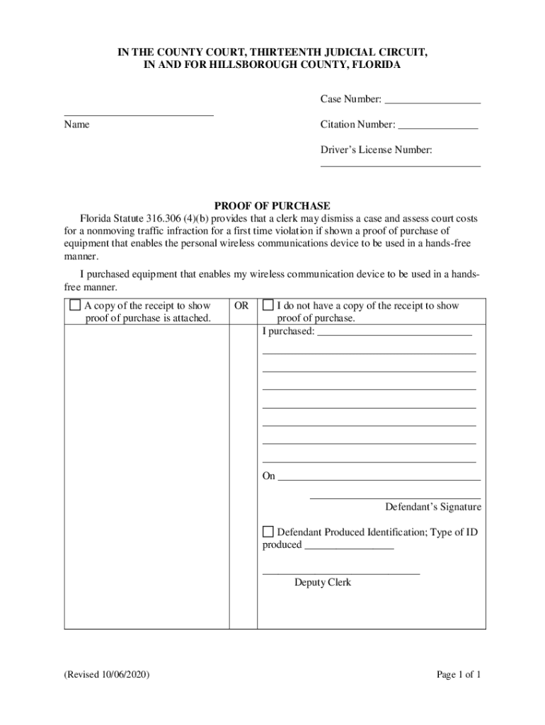 IN THE COUNTY COURT, THIRTEENTH JUDICIAL CIRCUIT, IN AND FOR HILLSBOROUGH COUNTY, FLORIDA Case Number: Meditation Number: Driver's License Number: PROOF OF PURCHASE Florida Statute 316.306 (4)(b)