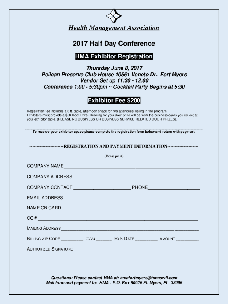 Health Management Association 2017 Half Day Conference MA Exhibitor Registration Thursday, June 8, 2017, Pelican Preserve Club House 10561 Veneto Dr., Fort Myers Vendor Set up 11:30 12:00 Conference
