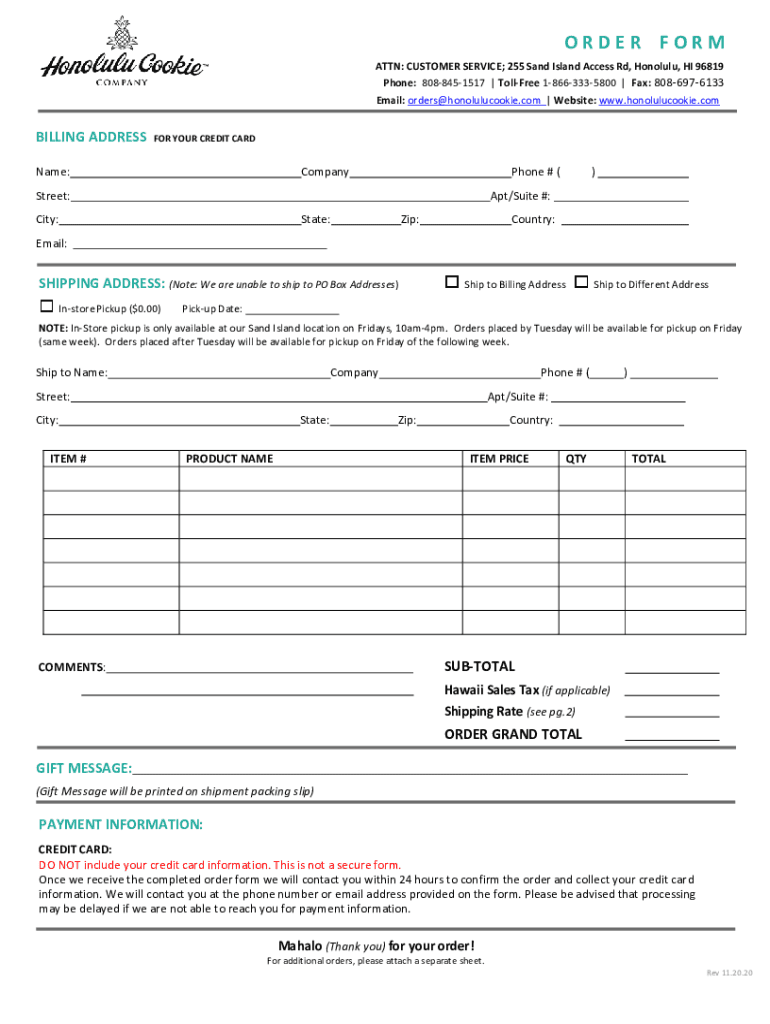 ORDER FORM ATTN: CUSTOMER SERVICE; 255 Sand Island Access Rd, Honolulu, HI 96819 Phone: 8088451517 Toll-free 18663335800 Fax: 8086976133 Email: orders honolulucookie.com Website: www.honolulucookie.comBILLING