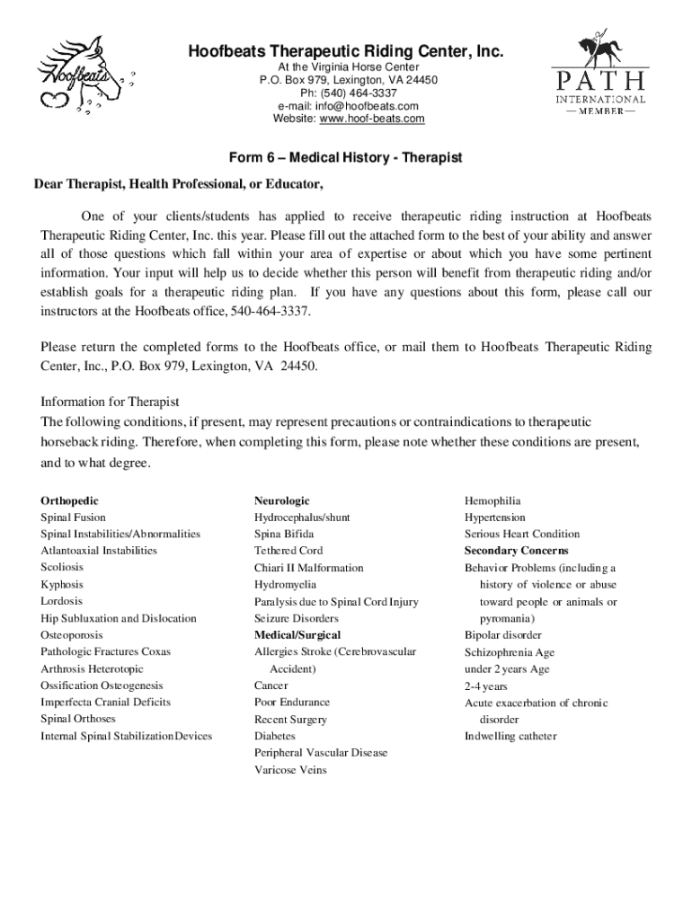 Hoof beats Therapeutic Riding Center, Inc. At the Virginia Horse Center P.O. Box 979, Lexington, VA 24450 pH: (540) 4643337 email: info hoofbeats.com Website: www.hoofbeats.comForm 6 Medical History