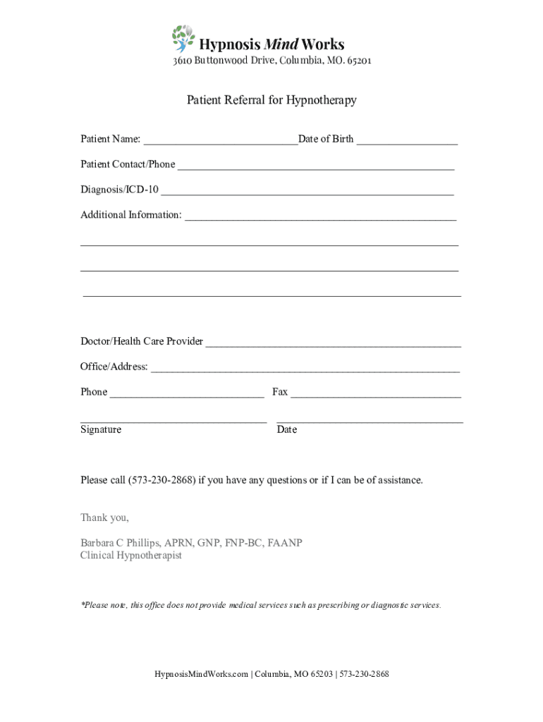Hypnosis Mind Works 3610 Buttonwood Drive, Columbia, MO. 65201Patient Referral for Hypnotherapy Patient Name: Date of Birth Patient Contact/Phone Diagnosis/ICD10 Additional Information: Doctor/Health