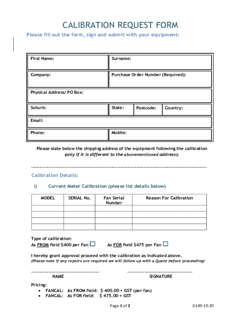 CALIBRATION REQUEST FORM Please fill out the form, sign and submit with your equipment:First Name:Surname:Company:Purchase Order Number (Required):Physical Address/ PO Box:Suburb:State:Postcode:Country:Email: