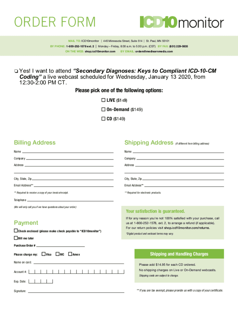 ORDER FORM MAIL TO: ICD10monitor 445 Minnesota Street, Suite 514 St. Paul, MN 55101 BY PHONE: 18002521578 ext. 2 Monday Friday, 8:00 a.m. to 5:00 p.m. (CST) BY FAX: (651) 2290835 ON THE WEB: shop.icd10monitor.comedy
