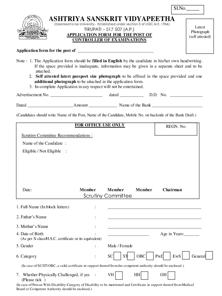 SL. No. ASHTRAY SANSKRIT VIDYAPEETHA (Deemed to be University Established under section 3 of UGC Act, 1956)The Latest Photograph (self attested)TIMPANI 517 507 (A.P.) APPLICATION FORM FOR THE POST
