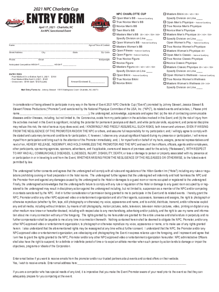 2021 NPC Charlotte Coventry FORM April 17, 2021, Charlotte, NC An NPC Sanctioned Event Name Age at Time of Contest Street Address City State Zip Code Phone Email Body weight Anticipated Competition