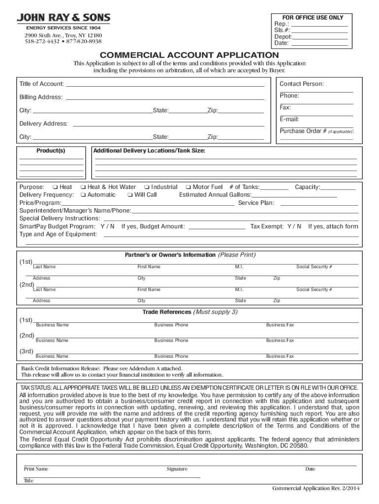 FOR OFFICE USE ONLY Rep.: SLS.#: Depot: Date: 2900 Sixth Ave., Troy, NY 12180 5182724432 8778208938COMMERCIAL ACCOUNT Applications Application is subject to all the terms and conditions provided with