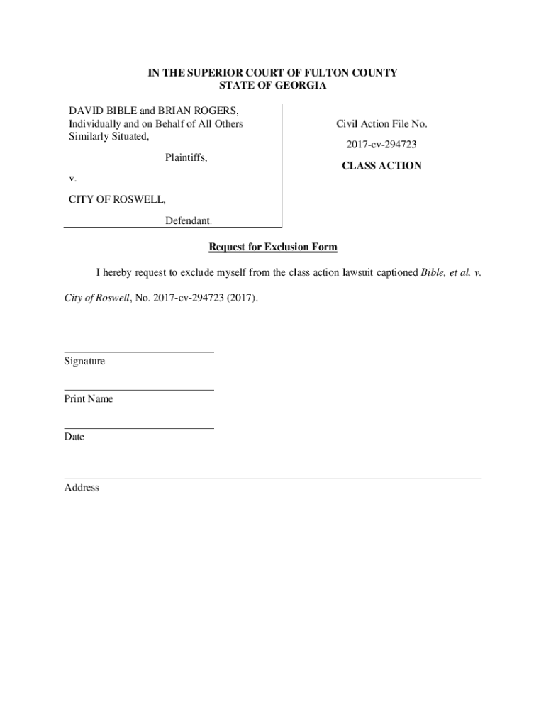 IN THE SUPERIOR COURT OF FULTON COUNTY STATE OF GEORGIA DAVID BIBLE and BRIAN ROGERS, Individually and on Behalf of All Others Similarly Situated, Civil Action File No. Plaintiffs,2017cv294723 CLASS