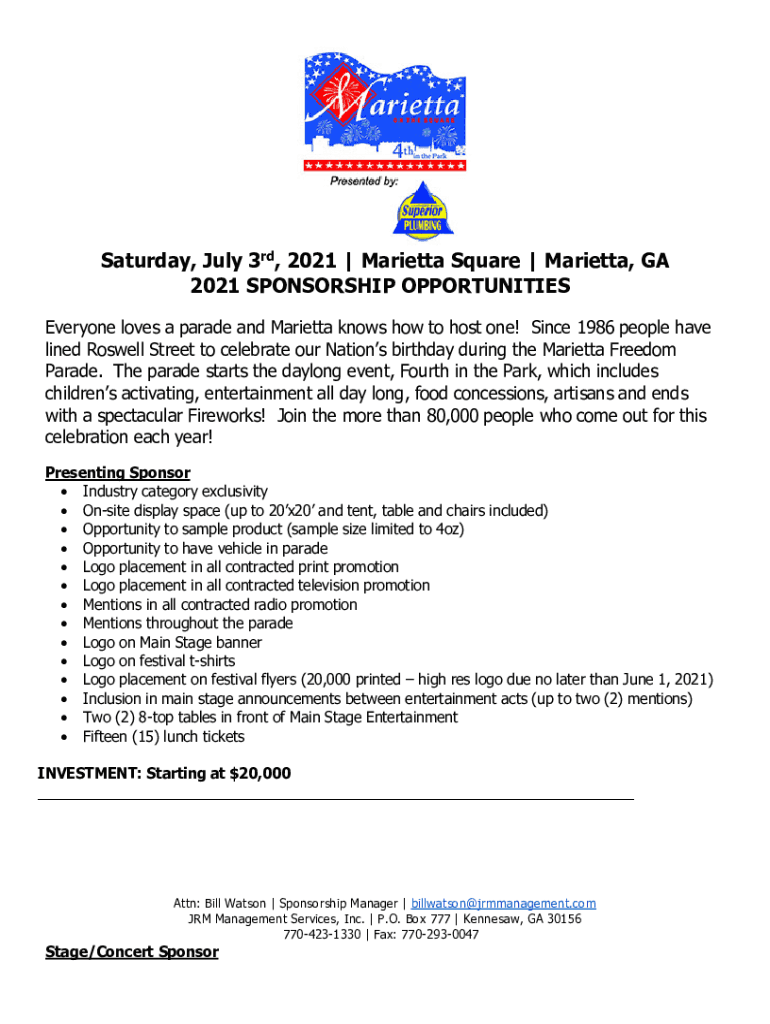 Saturday, July 3rd, 2021 Marietta Square Marietta, GA 2021 SPONSORSHIP OPPORTUNITIES Everyone loves a parade and Marietta knows how to host one! Since 1986 people have lined Roswell Street to celebrate