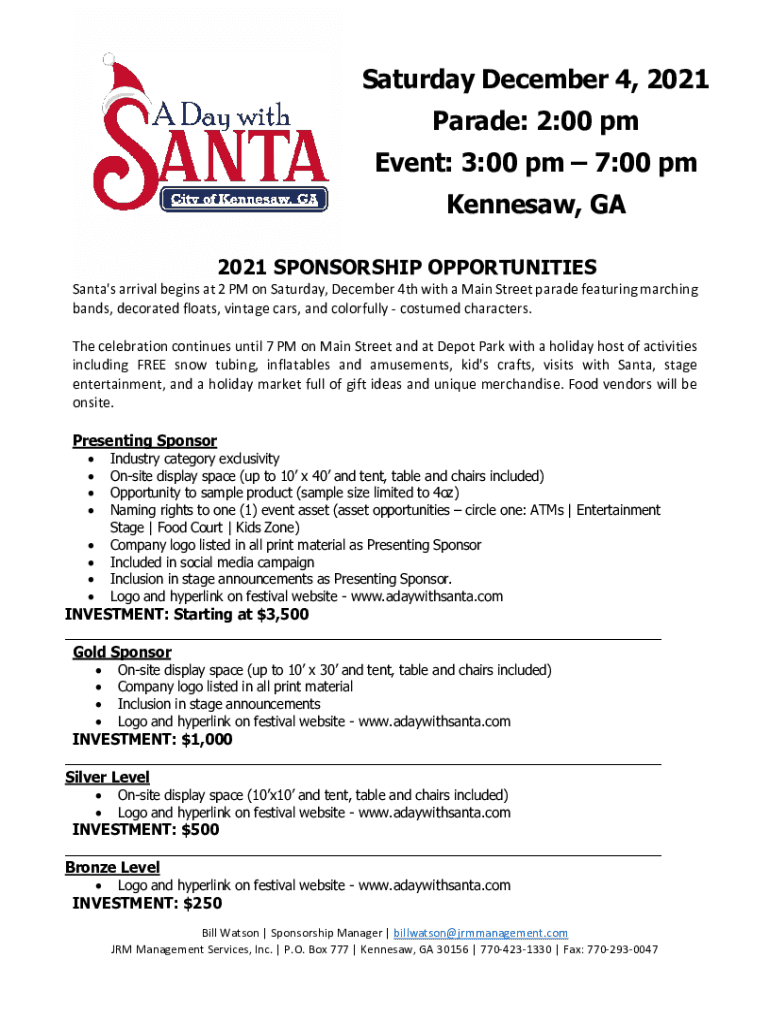 Saturday, December 4, 2021, Parade: 2:00 pm Event: 3:00 pm 7:00 pm Kennesaw, GA 2021 SPONSORSHIP OPPORTUNITIES Santa's arrival begins at 2 PM on Saturday, December 4th with a Main Street parade featuring