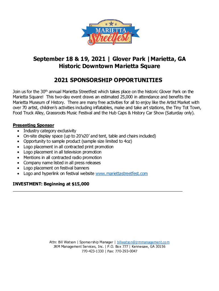 September 18 & 19, 2021 Glover Park Marietta, GA Historic Downtown Marietta Square 2021 SPONSORSHIP OPPORTUNITIES Join us for the 30th annual Marietta Street fest which takes place on the historic