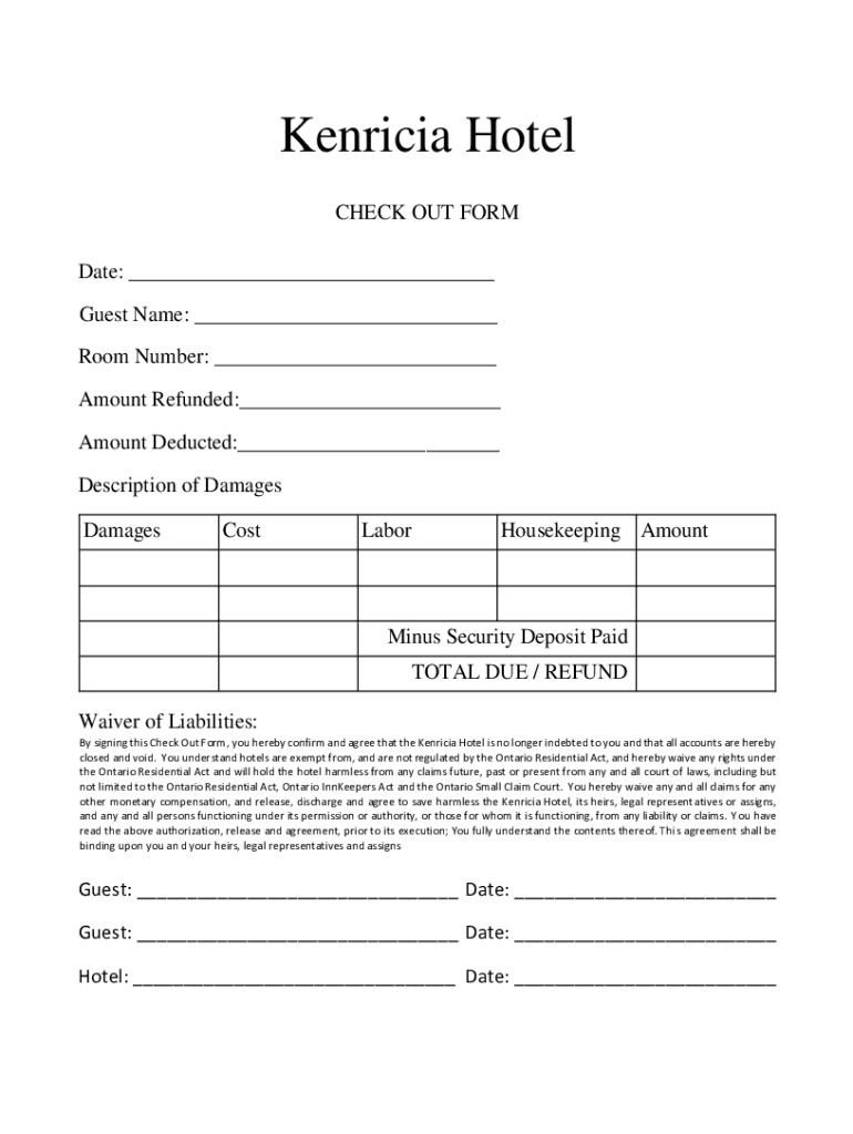 Several key features define the Kenricia Hotel Check Out Form, including a set of fillable fields designed to capture essential information. The form includes significant sections such as the waiver of liabilities, highlighting the importance of transparency in dealings.