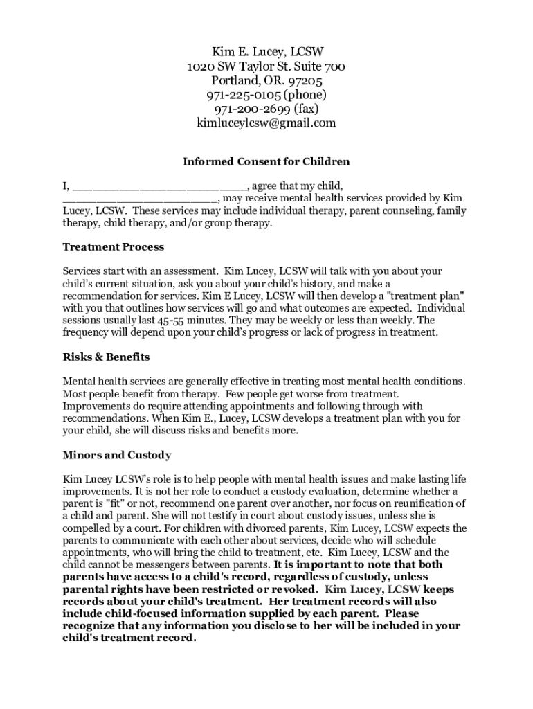 Kim E. Luca, LCSW 1020 SW Taylor St. Suite 700 Portland, OR. 97205 9712250105 (phone) 9712002699 (fax) kimluceylcsw gmail.com Informed Consent for Children I, agree that my child, may receive mental