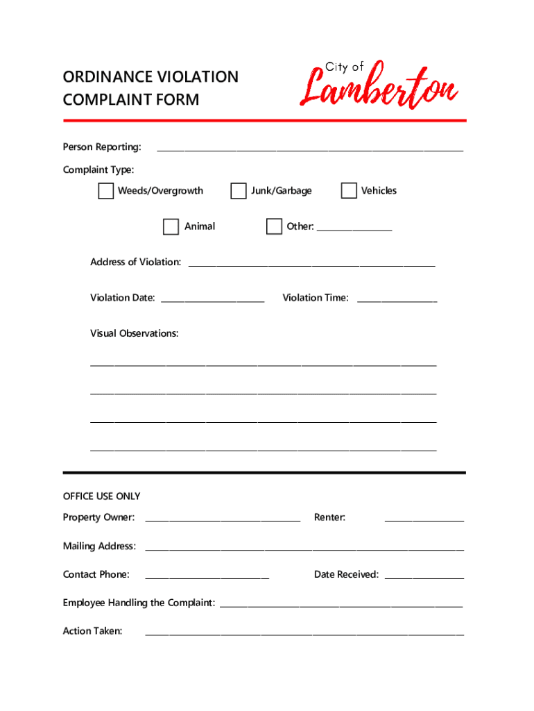 Get the free ORDINANCE VIOLATION COMPLAINT FORM - lambertonmn.com