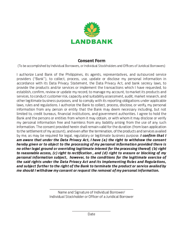 (To be accomplished by Individual Borrowers, or Individual Stockholders and Officers of Juridical Borrowers)I authorize Land Bank of the Philippines, its agents, representatives, and
