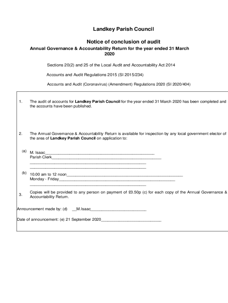 Land key Parish Council Notice of conclusion of audit Annual Governance & Accountability Return for the year ended 31 March 2020 Sections 20(2) and 25 of the Local Audit and Accountability Act 2014