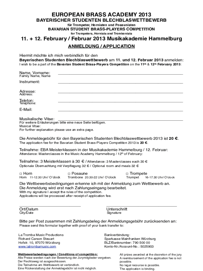 EUROPEAN BRASS ACADEMY 2013 BAYERISCHER STUDENT EN BLECHBLASWETTBEWERB for Trumpeter, Hoisted UND PosaunistenBAVARIAN STUDENT BALLPLAYERS COMPETITION for Trumpeters, Hoists and Trombonists11. + 12.