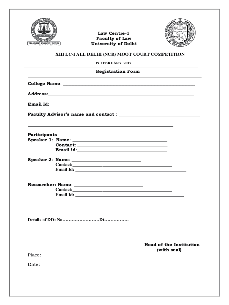 Law Centre1 Faculty of Law University of Delhi XIII LCD ALL DELHI (NCR) MOOT COURT COMPETITION 19 FEBRUARY 2017Registration Form College Name: Address: Email ID: Faculty Advisors name and contact