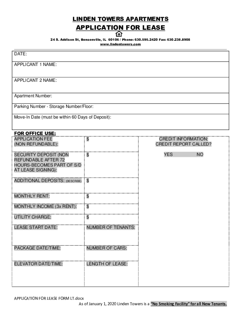 LINDEN TOWERS APARTMENTSAPPLICATION FOR LEASE 24 S. Addison St, Bentonville, IL 60106 / Phone: 630.595.2420 Fax: 630.238.8908 www.lindentowers.comDATE: APPLICANT 1 NAME:APPLICANT 2 NAME:Apartment