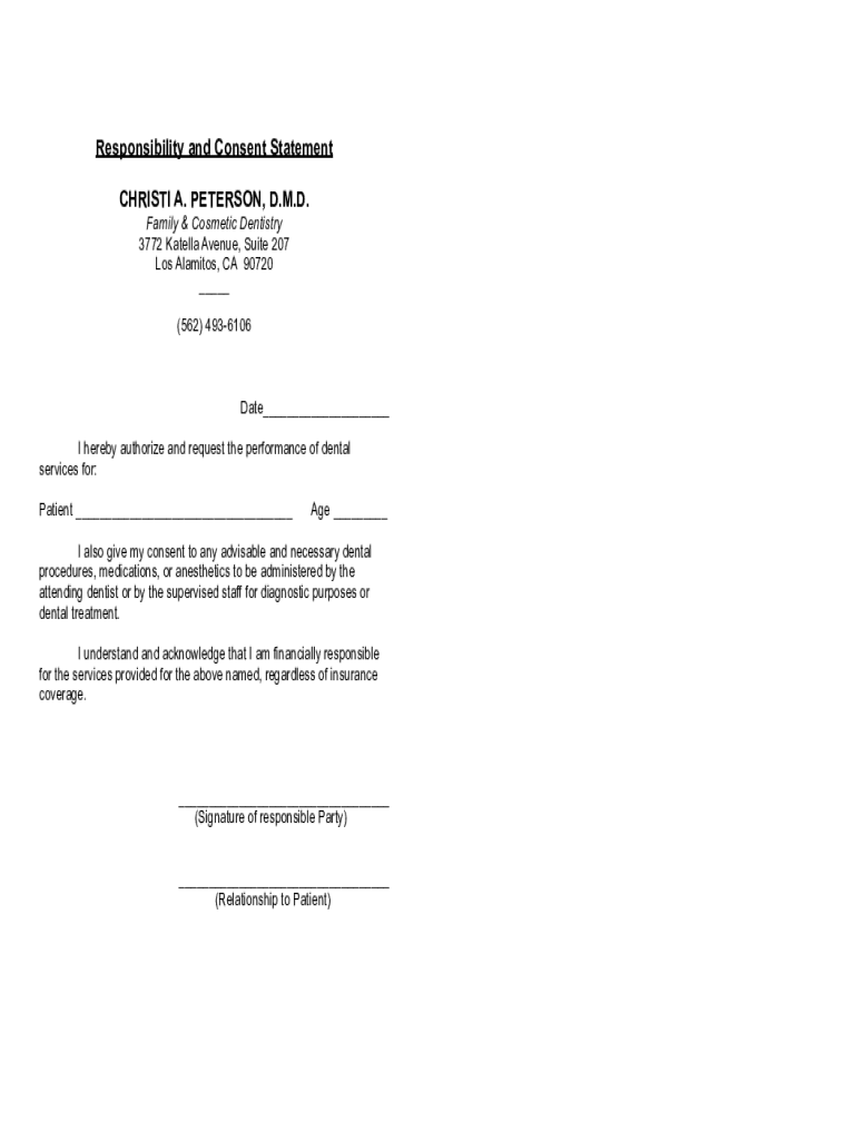 Responsibility and Consent Statement CHRISTI A. PETERSON, D.M.D. Family & Cosmetic Dentistry 3772 Patella Avenue, Suite 207 Los Calamitous, CA 90720 (562) 4936106Date I hereby authorize and request
