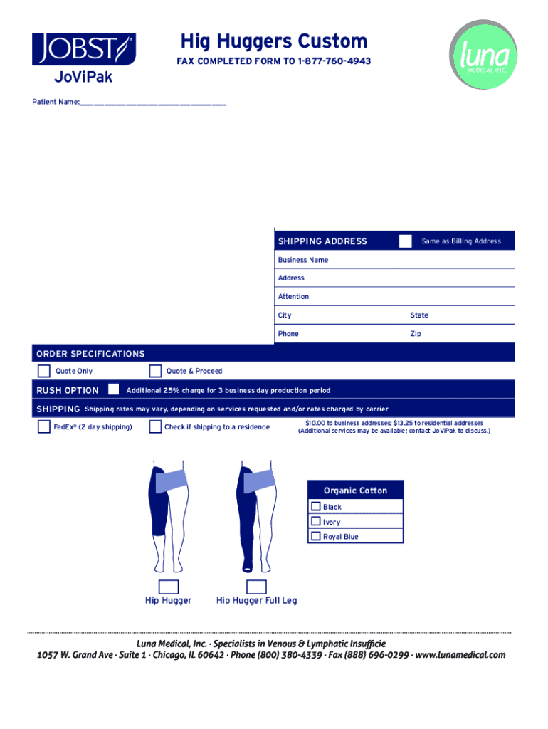 His Huggers Custom FAX COMPLETED FORM TO 18777604943Previous Patient? Patient Name: Height: Weight: Birthdate: Primary (congenital)Yes Arno Secondary Lymphedema(if no selection is made, Jovial will