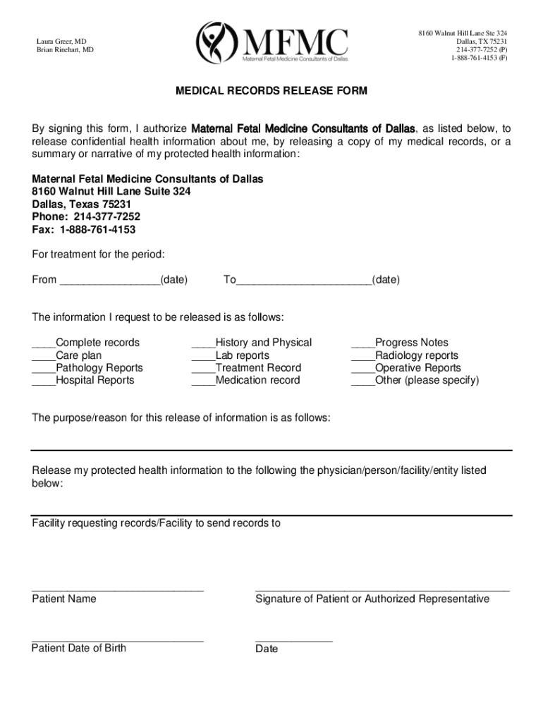 Brian Reinhart, MEDICAL RECORDS RELEASE Form signing this form, I authorize Maternal Fetal Medicine Consultants