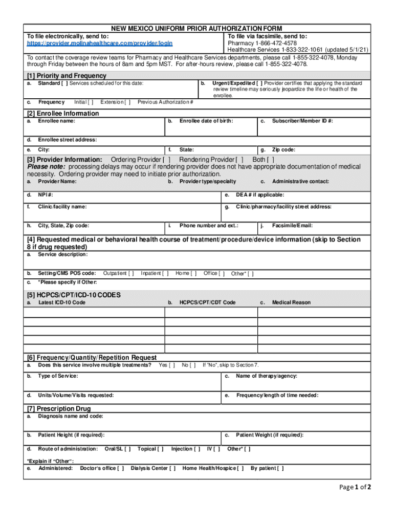 NEW MEXICO UNIFORM PRIOR AUTHORIZATION FORM To file electronically, send to: https://provider.molinahealthcare.com/provider/loginTo file via facsimile, send to: Pharmacy 18664724578 Healthcare Services
