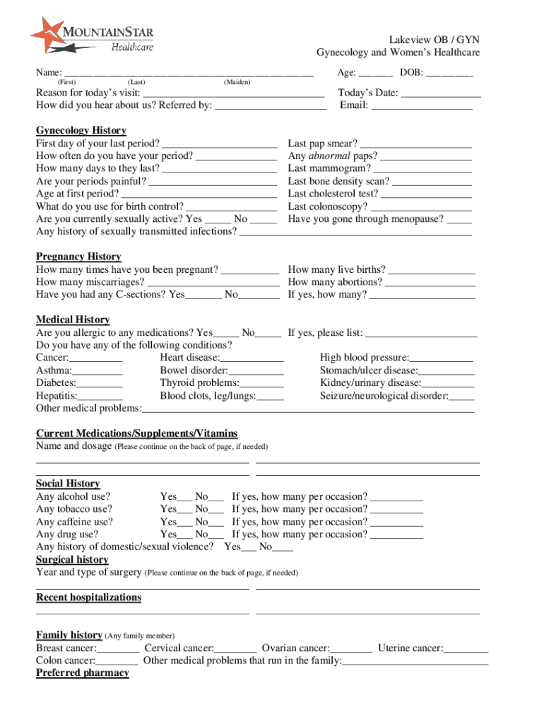 Lake view OB / GUN Gynecology and Women's Healthcare Name: (First)(Last)Age: DOB: (Maiden)Reason for today's visit: How did you hear about us? Referred by: Today's Date: Email: Gynecology History