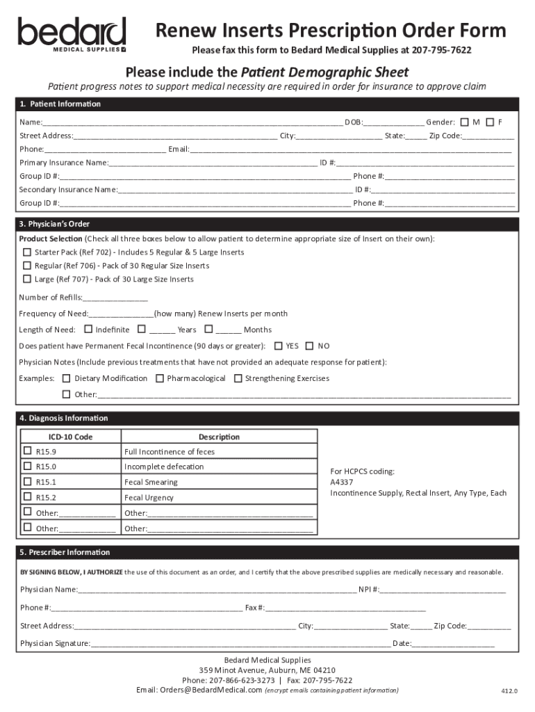 Renew Inserts Prescription Order Form Please fax this form to Beard Medical Supplies at 2077957622Please include the Patient Demographic SheetPatient progress notes to support medical necessity are