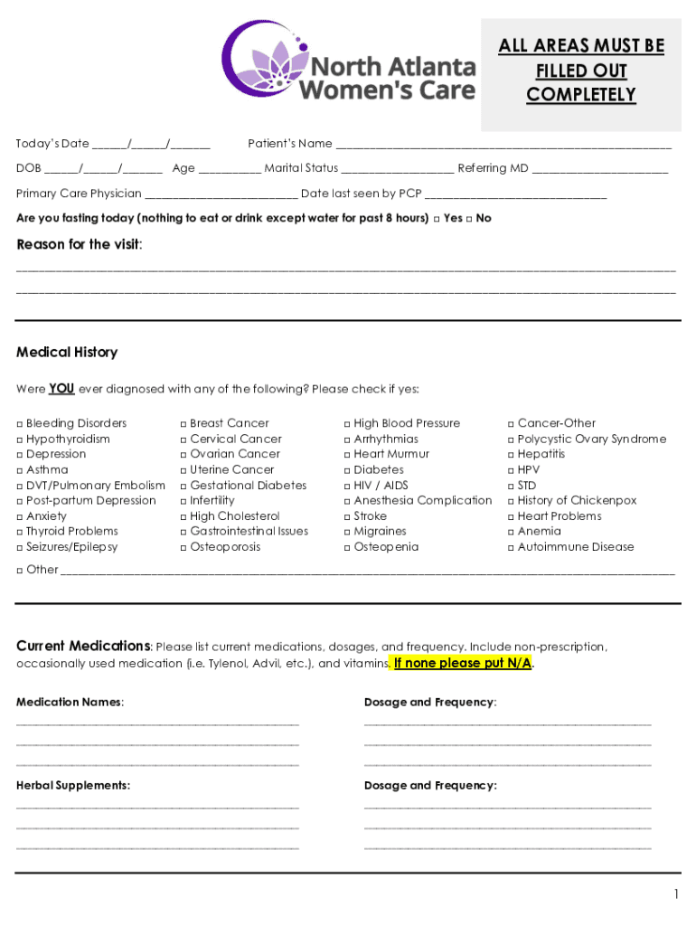 ALL AREAS MUST BE FILLED OUT COMPLETELY Today's Date / / Patients Name DOB / / Age Marital Status Referring MD Primary Care Physician Date last seen by PCP Are you fasting today (nothing to eat or