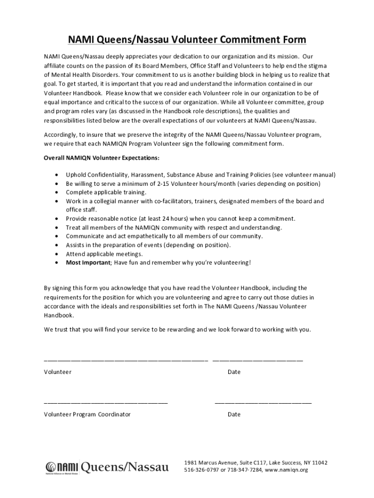 NAMIQueens/NassauVolunteerCommitmentForm NAMIQueens/Nassaudeeplyappreciatesyourdedicationtoourorganizationanditsmission. Our affiliatecountsonthepassionofitsBoardMembers, OfficeStaffandVolunteerstohelpendthestigma