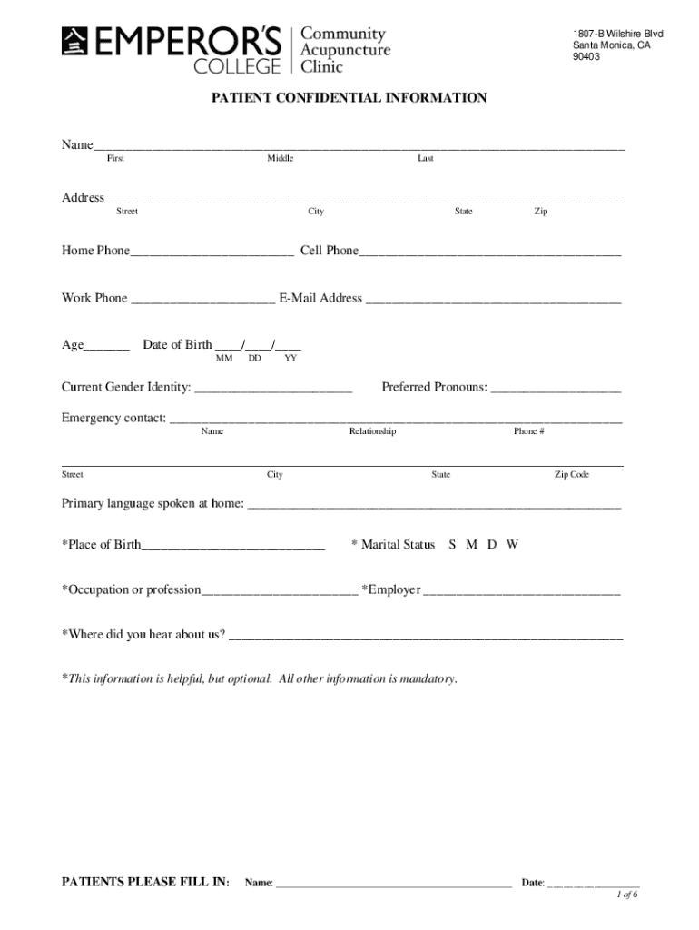 1807B Wilshire Blvd Santa Monica, CA 90403 310.453.8383PATIENT CONFIDENTIAL INFORMATION Name FirstMiddleLastAddress StreetCityStateZipHome Phone Cell Phone Work Phone Email Address Age Date of Birth