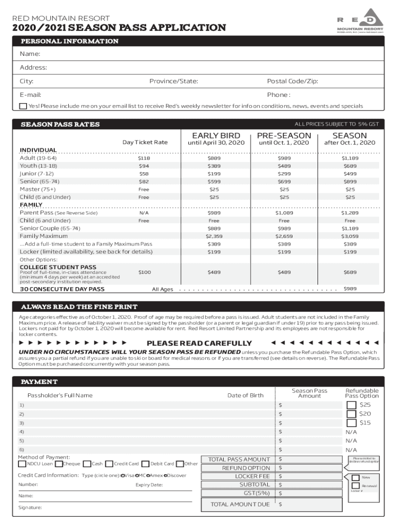 RED MOUNTAIN RESORT2020/2021 SEASON PASS APPLICATION