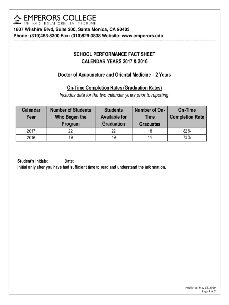1807 Wilshire Blvd, Suite 200, Santa Monica, CA 90403 Phone: (310)4538300 Fax: (310)8293838 Website: www.emperors.eduSCHOOL PERFORMANCE FACT SHEET CALENDAR YEARS 2017 & 2016 Doctor of Acupuncture