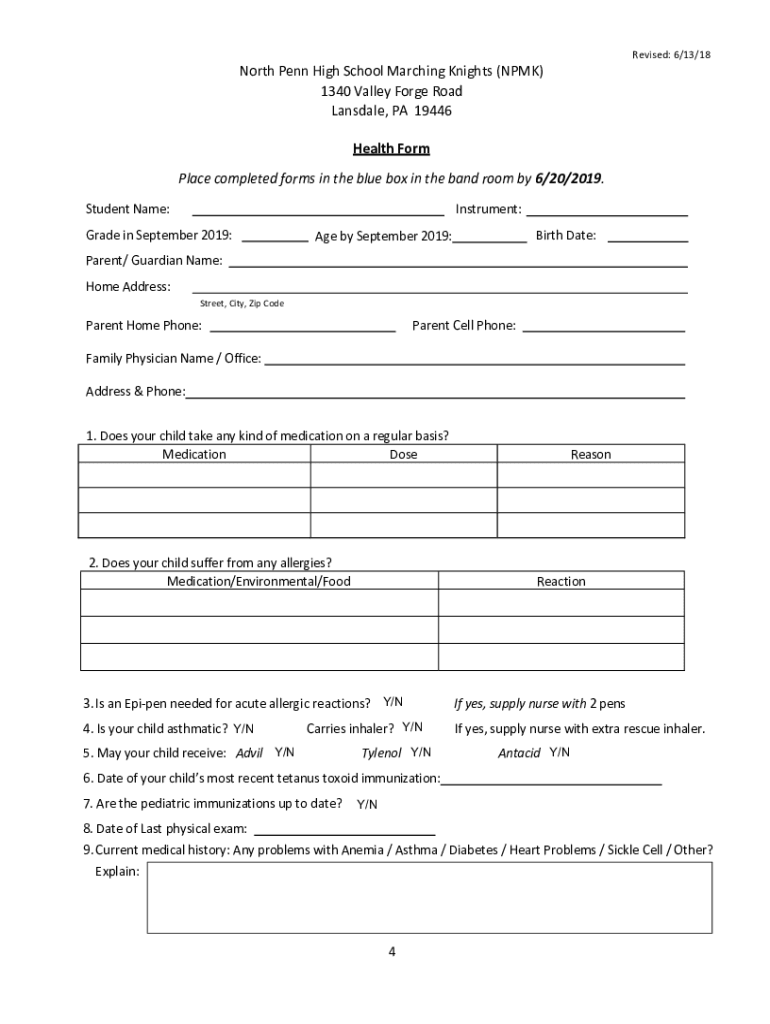 Revised: 6/13/18North Penn High School Marching Knights (NP MK) 1340 Valley Forge Road Lawndale, PA 19446 Health Form Place completed forms in the blue box in the band room by 6/20/2019. Student Name:Instrument:Grade