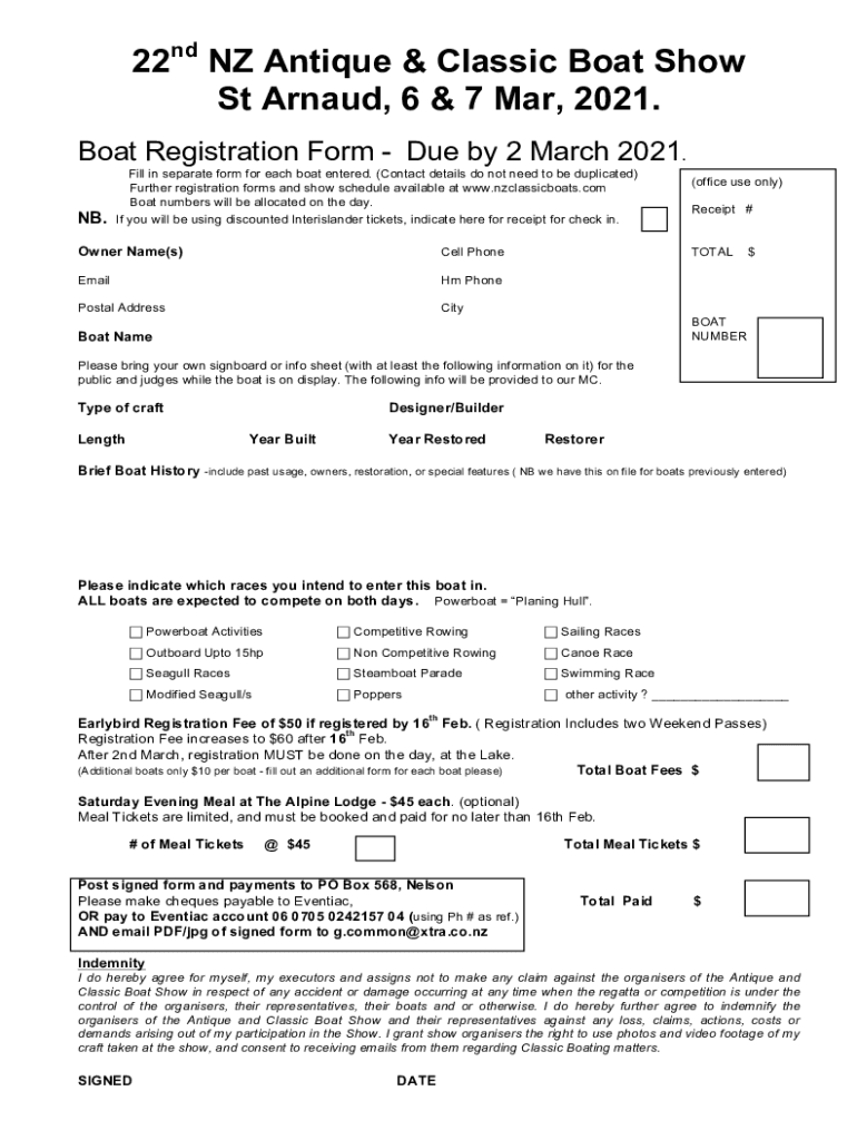 22nd NZ Antique & Classic Boat Show St Arnaud, 6 & 7 Mar, 2021. Boat Registration Form Due by 2 March 2021. NB. Fill in separate form for each boat entered. (Contact details do not need to be duplicated)