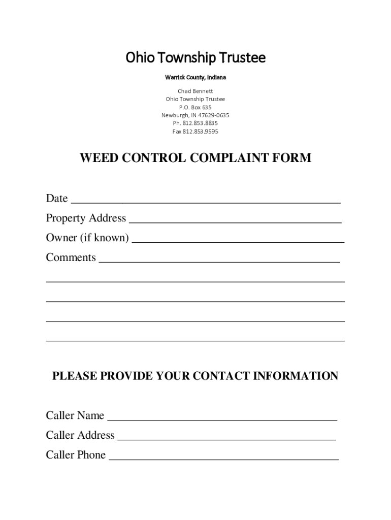 Ohio Township Trustee Warrick County, Indiana Chad Bennett Ohio Township Trustee P.O. Box 635 Newburgh, IN 476290635 pH. 812.853.8835 Fax 812.853.9595WEED CONTROL COMPLAINT FORM Date Property Address
