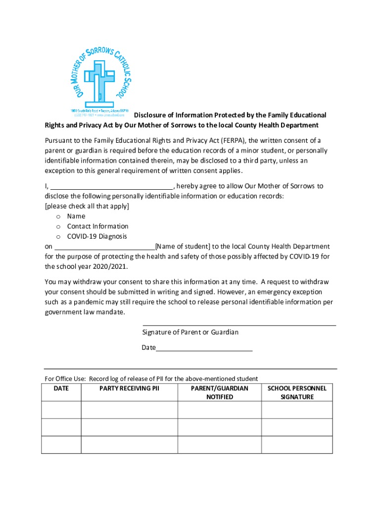 Disclosure of Information Protected by the Family Educational Rights and Privacy Act by Our Mother of Sorrows to the local County Health Department Pursuant to the Family Educational Rights and Privacy