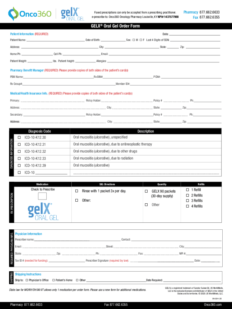Faxed prescriptions can only be accepted from a prescribing practitioner. Prescribe to: Onco360 Oncology Pharmacy Louisville, KY NPI# 1437577988Pharmacy 877.662.6633 Fax 877.662.6355GELX Oral Gel