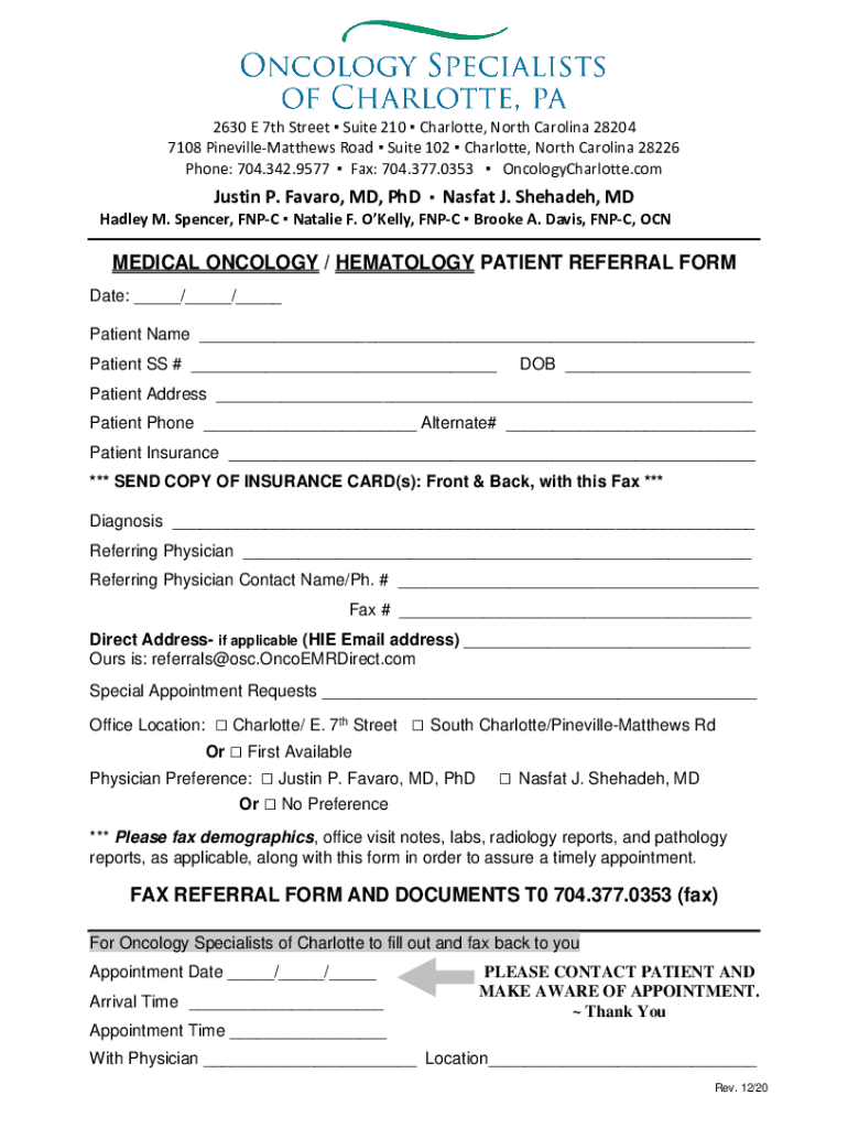 2630 E 7th Street Suite 210 Charlotte, North Carolina 28204 7108 PinevilleMatthews Road Suite 102 Charlotte, North Carolina 28226 Phone: 704.342.9577 Fax: 704.377.0353 Oncology Charlotte.com Justin