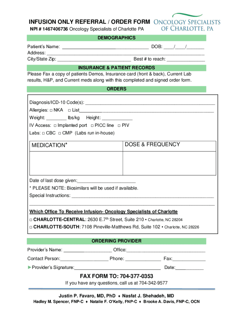 INFUSION ONLY REFERRAL / ORDER FORM NPI # 1467406736 Oncology Specialists of Charlotte PA DEMOGRAPHICS Patients Name: DOB: / / Address: City/State Zip: Best # to reach: INSURANCE & PATIENT RECORDS