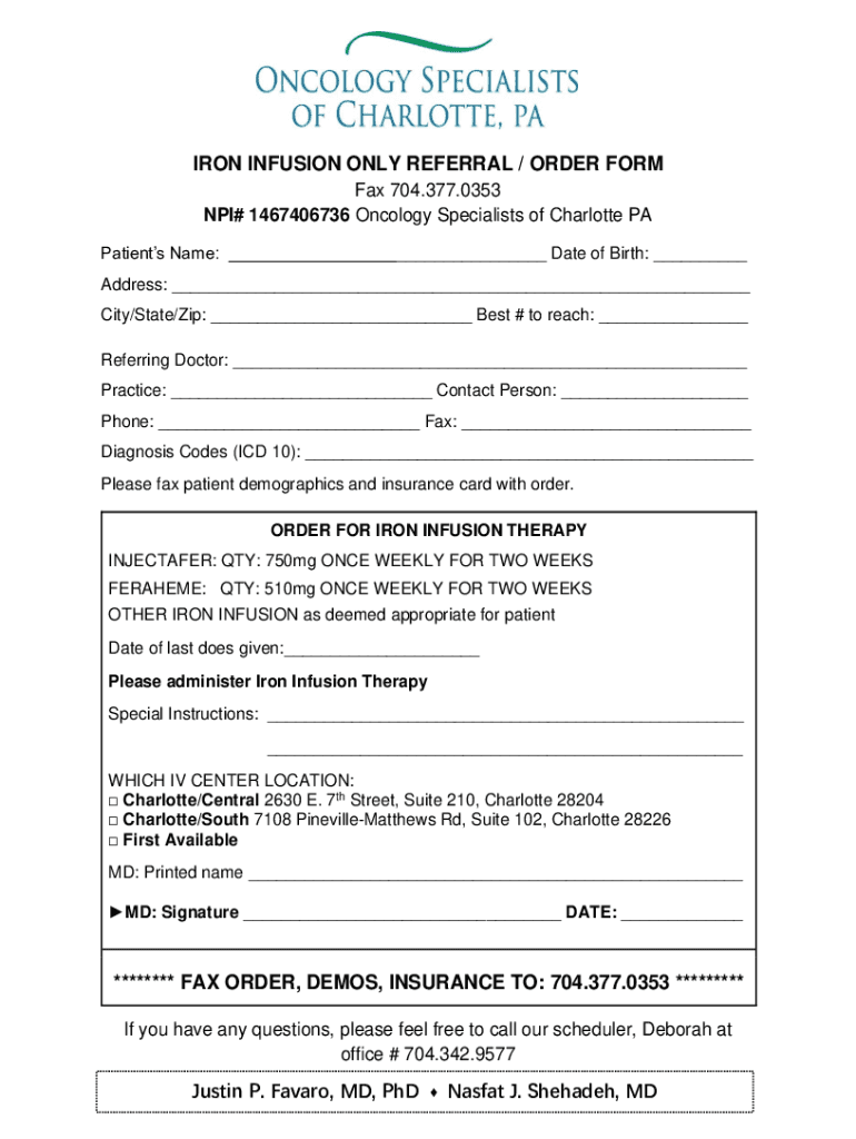 IRON INFUSION ONLY REFERRAL / ORDER FORM Fax 704.377.0353 NPI# 1467406736 Oncology Specialists of Charlotte PA Patients Name: Date of Birth: Address: City/State/Zip: Best # to reach: Referring Doctor:
