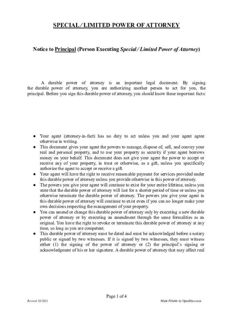 SPECIAL LIMITED POWER OF ATTORNEYNotice to Principal (Person Executing Special Limited Power of Attorney)A durable power of attorney is an important legal document. By signing the durable power of
