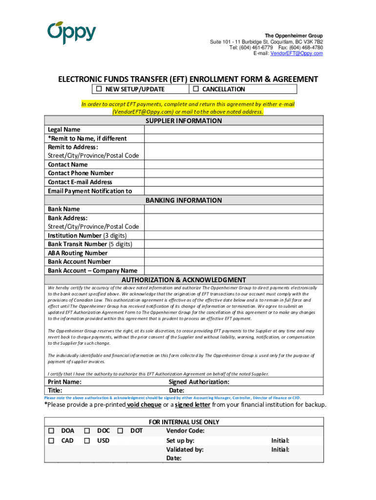The Oppenheimer Group Suite 101 11 Bridge St, Coquitlam, BC V3K 7B2 Tel: (604) 4616779 Fax: (604) 4684780 Email: Vendor EFT Poppy. Electronic FUNDS TRANSFER (EFT) ENROLLMENT FORM & AGREEMENT NEW SETUP/UPDATE