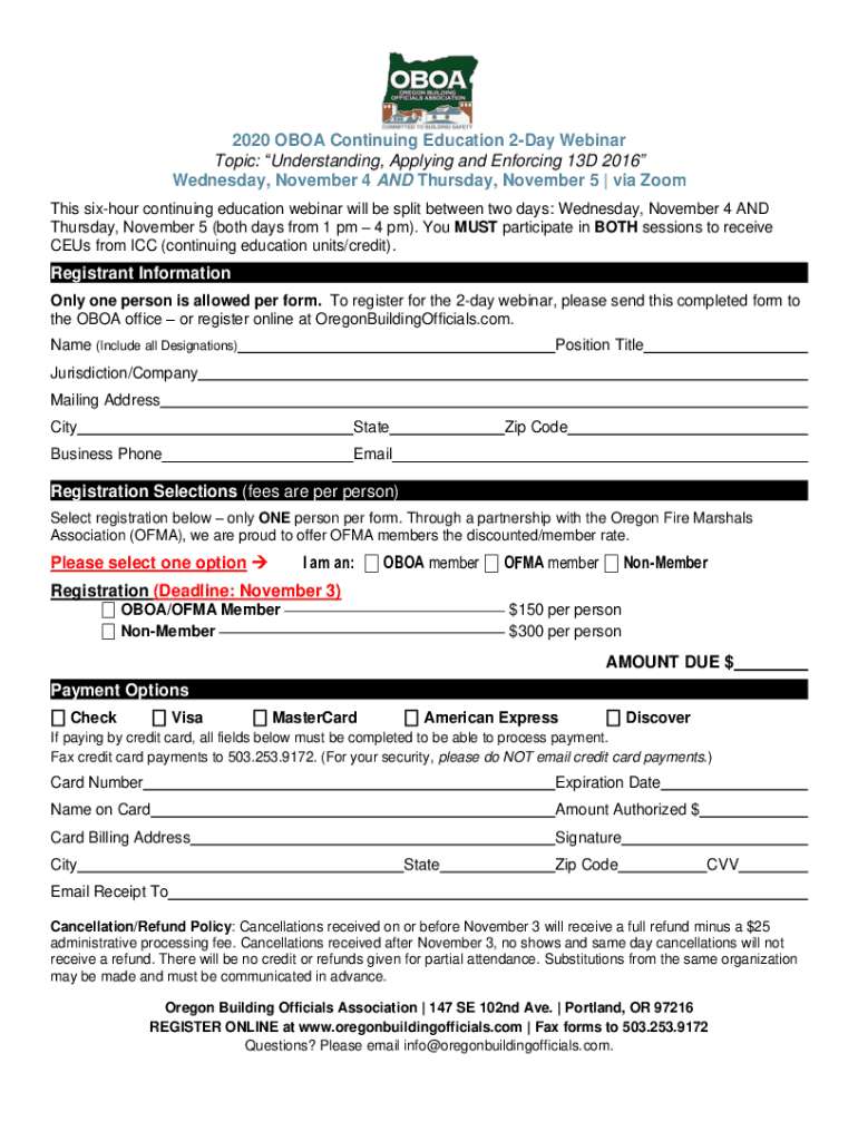 2020 OBOE Continuing Education 2Day Webinar Topic: Understanding, Applying and Enforcing 13D 2016 Wednesday, November 4 AND Thursday, November 5 via Zoom This six hour continuing education webinar