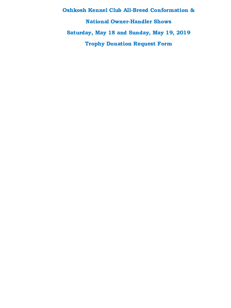 Oshkosh Kennel Club Allured Conformation & National OwnerHandler Shows Saturday, May 18 and Sunday, May 19, 2019, Trophy Donation Request Form3OHDVH6XSSRUWWKH(KLELWRUV Best In Show / NHS: $50.00 Reserve