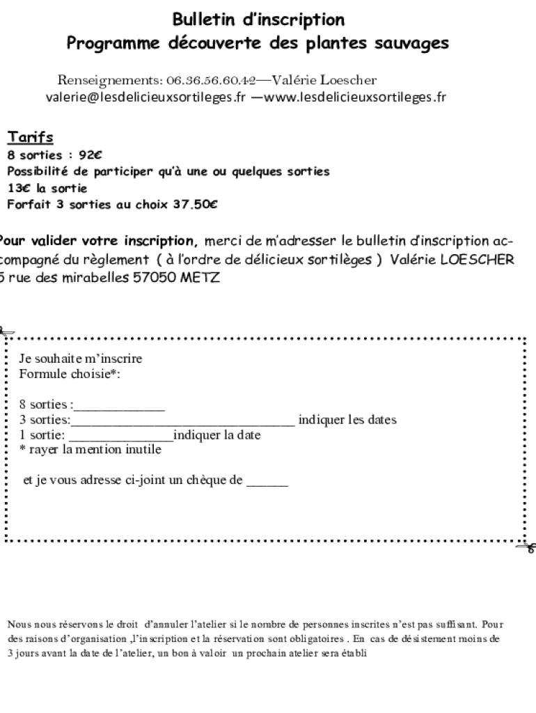Bulletin inscription Program converted DES plants sausages Restatements: 06.36.56.60.42Valrie Escher Valerie lesdelicieuxsortileges.fr www.lesdelicieuxsortileges.fr Tariff 8 sorties : 92 Possibility