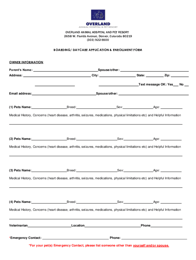 OVERLAND ANIMAL HOSPITAL AND PET RESORT 2658 W. Florida Avenue, Denver, Colorado 80219 (303) 9225500 BOARDING/ DAYCARE APPLICATION & ENROLLMENT FORMER INFORMATION Parents Name:Spouse/other:Address:City:State:Zip:Text