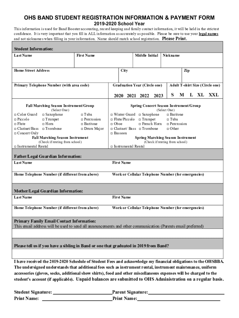 OHS BAND STUDENT REGISTRATION INFORMATION & PAYMENT FORM 20192020 School Year This information is used for Band Booster accounting, record keeping and family contact information, it will be held in